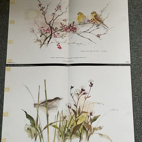 To tryk med fuglemotiv af Mads Stage - Nattergal og Kærsanger. I rammer med guldkant som medfølger (obs. Pappet bagpå har fået nogle mærker).