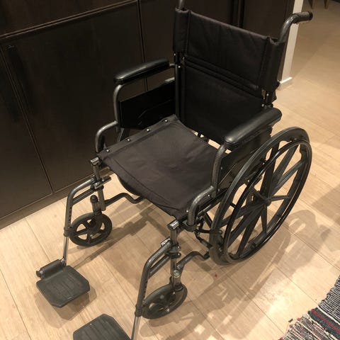 og armlæn for komfort. Hjulene har farverige detaljer på egerne. Velegnet til personer, der har brug for manuel mobilitetshjælp.
