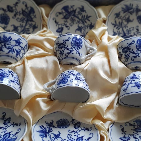 Designet er elegant i bløde creme- og blå nuancer, der giver et klassisk og stilrent udtryk. Perfekt til kaffe, te eller når der skal dækkes et pænt bord til gæster.