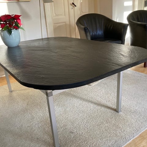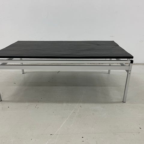 Eksklusivt sofabord med sort granitplade og stel i aluminium. Bordet kan justeres i højden fra 45–52 cm. Det har haft samme ejer siden 1970’erne og fremstår i særdeles flot stand. Møblet kommer fra et røg- og dyrefrit hjem og står uden fejl.