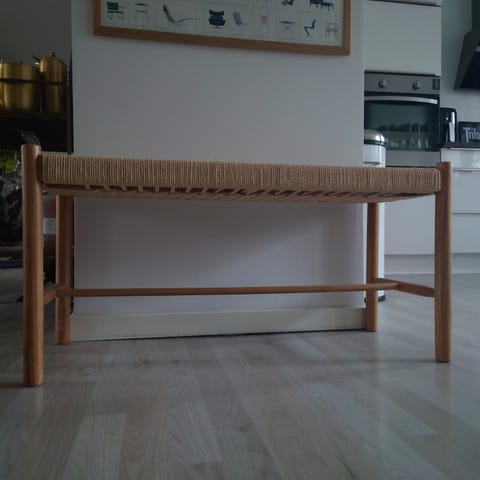 Indendørs egetræsbænk. Rødt betræk.