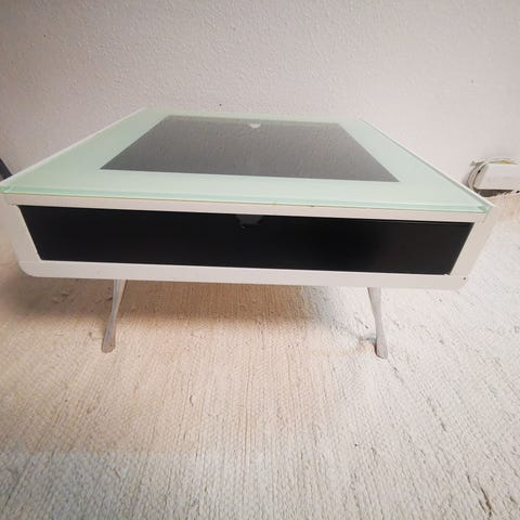 Stort firkantet sofabord med 2 rummelige skuffer og 2 hylder. Bordet bærer præg af brug og med ridser. Glaspladen ligger løs så man kan jo evt. udskifte den og så har man et flot bord til billige penge. Fra ikke ryger hjem.