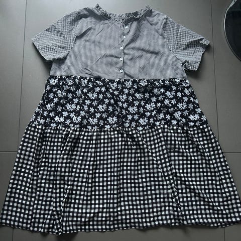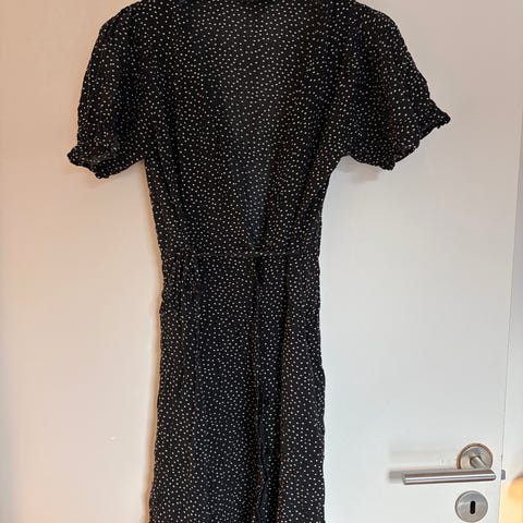 Kjolen er sort med et mønster af små blomster og er lavet af polyester. Egnet til hverdagsbrug.