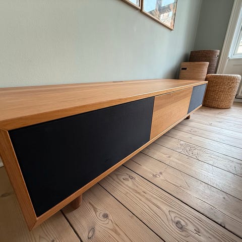 Bolia TV bord i træ med to åbne hylder og to skuffer. Møblet har et minimalistisk design med en naturlig træfinish og metalben.
