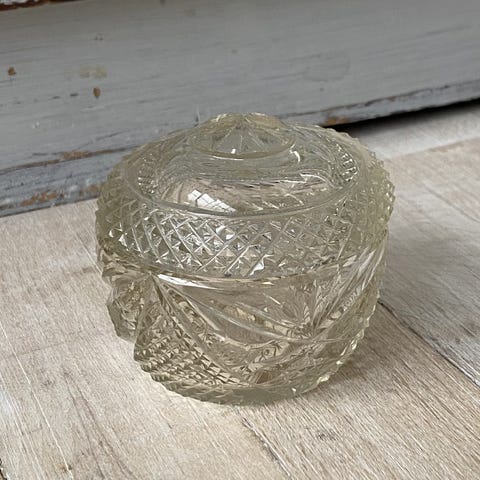 Meget gammel bonbonniere af glas og messing. Ca 1930/1940erne. Lidt uundgåelige brugsspor, men så smuk og i fin intakt stand. Lukkemekanismen er en anelse slap. Brug den feks til smykker, nips eller bare til pynt. H: ca 7 cm Ø: ca 9 cm. Kr 300,-