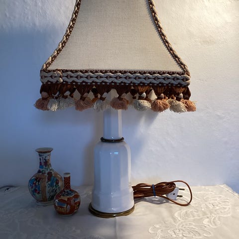 Velholdt Heiberg lampe. Med messing bund. Med skærm og pære.