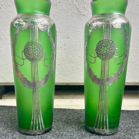 To små Jugend (Art Nouveau) grønne glas vaser med gulddekoration fra omkring 1900 til 1920.