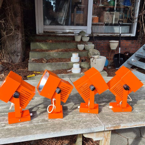 6 stk Finnerup Spots. Røde, næsten ikke brugt. Højde er 21 cm. Målene på lampehovedet er 12 x 12 cm. Lamperne er til max. 100W. Lampen har justerbar vinkel og er designet til brug med specifikke projektorer. Den er fremstillet af holdbart materiale og egnet til indendørs brug. Samlet pris