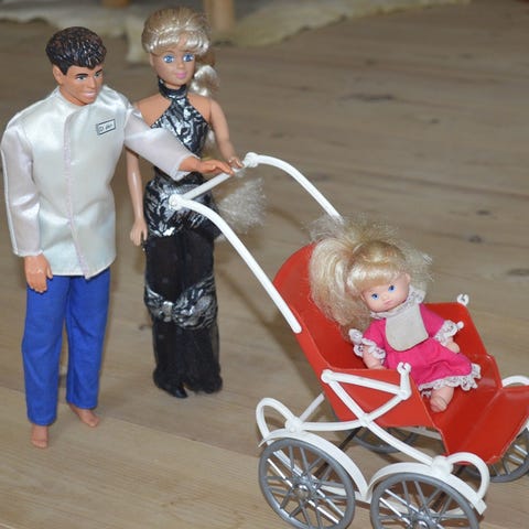 Ken og Barbie i sjovt og farverigt punk tøj med guitar og taske
