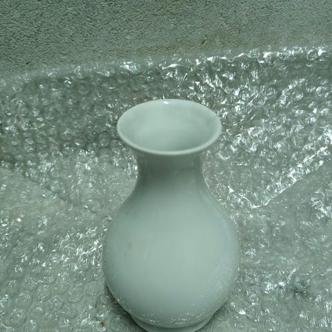 Pæn lille kuvertvase/vase i hvid porcelæn, med lille blomst på. 3-kantet.