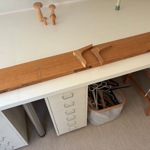 Hylde m. laminat og træ kant, Special fremstillet, Hylde med hvid laminat på begge sider. Eg kant på ene langside. 218 cm lang, 30 cm dyb og ca 27 mm tyk. Mindre afslag i laminateten i enderne. Fejler ellers intet. Forboret til skjult beslag. Beslag følger med