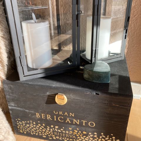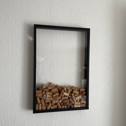 Foran er der glas, og i toppen er der hul, så man kan “smide ting i” – oprindeligt til vinpropper, men den kan bruges til alt muligt: bamser, souvenirs, LEGO-figurer, strandfund, dåbs-/konfirmationskort, biografbilletter osv.