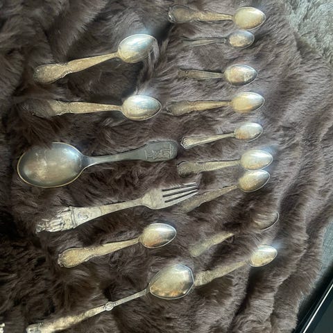Sæt bestående af 4 skeer og 3 gafler i sølv(plet). Bestikket er af forskellig alder. Den ældste fra 1834 og de øvrige fra første halvdel af 1900-tallet.