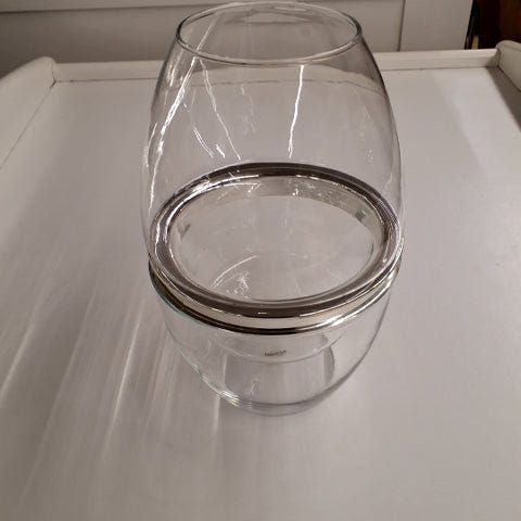 Tre delt glasvase med en metalring for stabilitet. Klart glas.,Afhentes i:,Røde Kors Ølby/Køge (259),Bemærk at mail, chat og beskeder ikke besvares, og varen skal købes på knappen "Gå til varen"