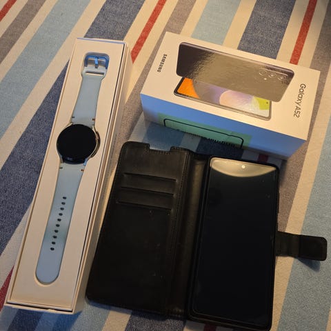 Mobiltelefon og smartwatch sælges til samlet pris.