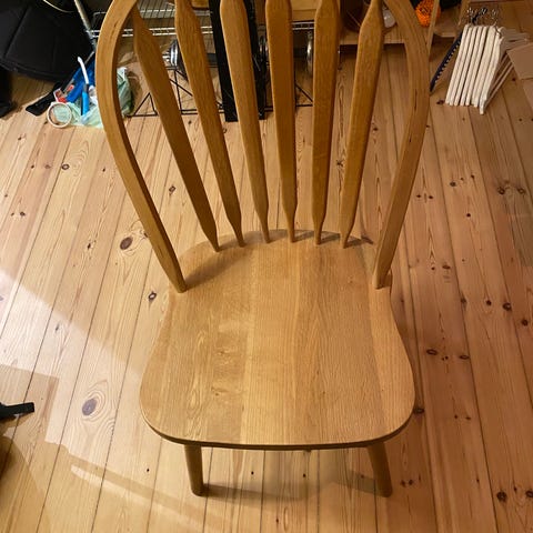 Stolene er udført i massivt bøgetræ med sæder i flet, og bærer præg af naturlig brug: