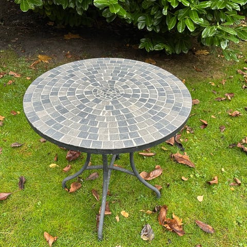 Bord med rund mosaikbordplade og sort metalstel. Bordpladen består af forskellige farvede sten i mosaikmønster. Passer til udendørs brug eller som dekorativt bord indendørs til fx altan.