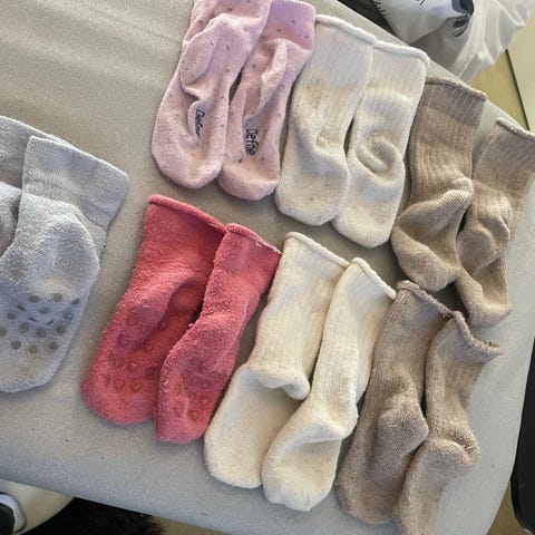 Dette er et sæt af seks par små børnesokker, hver par med farverige mønstre og design. Der er stribede sokker i forskellige blå nuancer, samt et par med et stjernen design. Derudover er der sokker med figurer som en hest og Peter Plys. Sokkerne er bløde og passer til små børn, ca. 15 cm lange.