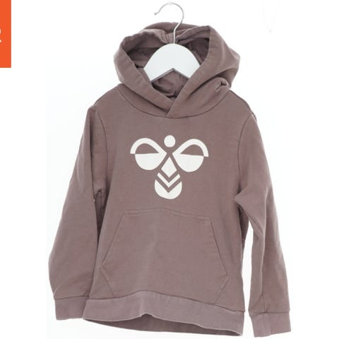 Hættetrøje i brun med et stort Hummel-logo på bagsiden. Trøjen har en hætte og lange ærmer med kontraststriber langs siden. Der er ingen synlige lukninger foran, hvilket antyder, at det er en pullover model.