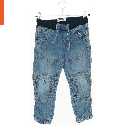 Disse børnebukser er lavet af denim materiale og har en mørk blå farve. De har elastik i taljen med en snøre, hvilket giver en komfortabel pasform. Foran har bukserne to lommer, og der er en baglomme bagpå. Bukserne har elastik ved anklerne.