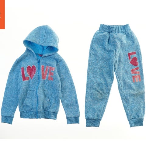 Bukserne er lavet af et denimlignende stof med elastisk talje og snøre for justerbar pasform. De er blå med lidt lysere fuger og har lommer på siden og bagpå. Enderne på benene har elastikkanter for ekstra komfort.
