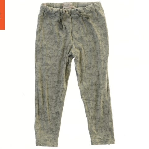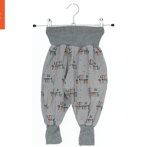 Bukserne er lavet af blødt materiale og har en elastisk linning. Nederst på det ene ben er der broderet tekst og motiv. Bukserne er designet med rib ved anklerne.