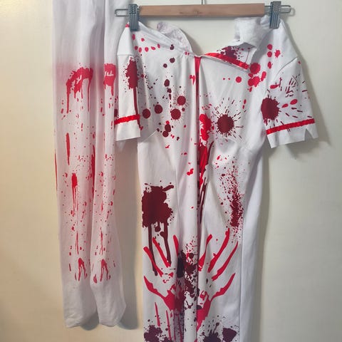 Hvid sygeplejerske kostume med røde detaljer. Kostumet har korte ærmer med røde kanter og en rød stribe ved halsen. Der er også en hvid hue med et rødt kors på.