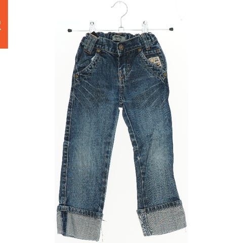 Børnejeans i blå med elastisk talje og snor. Bukserne har to forlommer, en sidelomme med knap, og to baglommer. Materialet er denim, og bukserne har et vasket look.
