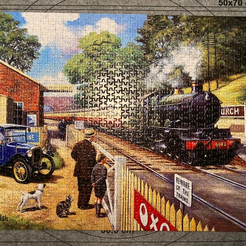 Dette er et puslespil med 1000 brikker, der viser et maleri af tog, som kører gennem et naturskønt landskab med bjerge, floder og skove. Puslespillet er af mærket Amy Design, og når det er samlet, har det en størrelse på 68x49 cm.