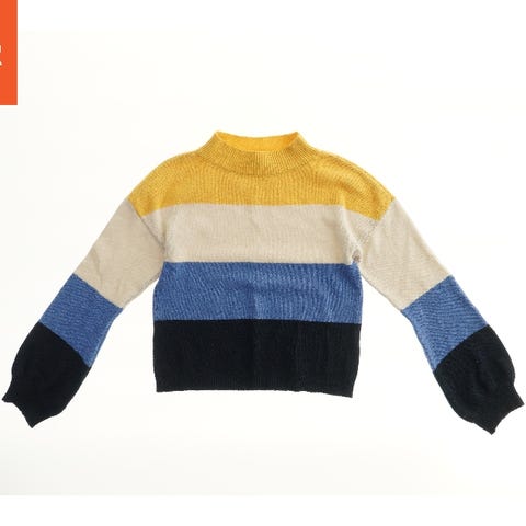 En blå strikket sweater til børn med lange ærmer og rund halsudskæring. Sweateren har et bølgemønster og ribkanter ved ærmerne og omkring taljen.