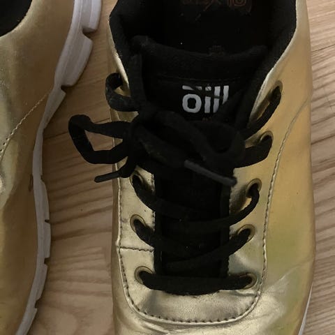 Disse guld sneakers er størrelse 38 og har et unikt design med perforeret materiale for øget ventilation. Skoene har en snørebåndslukning og en robust sål med en markant grøn undersål og en indvendig syning. På hælen ses et logo, der kan indikere mærket. Overordnet har skoene en metallisk guld farve, som skaber et skinnende udtryk.