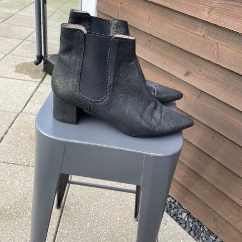 Dette er et par sorte støvler med en blokhæl og størrelse 38. Støvlerne har en lynlås på siden til nem påføring. Designet er enkelt og stilfuldt, velegnet til hverdagsbrug.