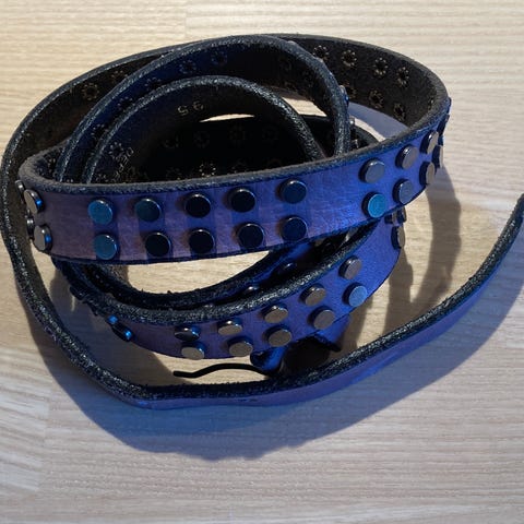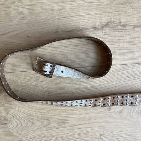 Bælte fremstillet af brunt læder, detaljeret med en præget struktur som imiterer krokodillehud. Udstyret med et guldspænde, som giver et elegant og klassisk look. Bæltets længde er 90 cm, og det kan justeres i størrelsen ved hjælp af flere huller. Indersiden af bæltet viser tegn på brug, men der er ingen synlige skader på læderet eller spænde.