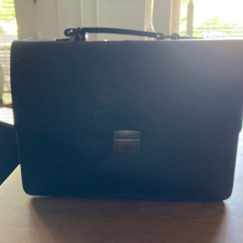 Tasken er lavet af brunt kernelæder og har en justerbar skulderrem, samt en bærerem. Den har et hovedrum med en klaplås og en lynlåslomme bagpå. Intern opbevaring inkluderer flere mindre rum til personlig opbevaring og dokumenter. Målene er 21x28x8 cm.