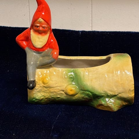 Gammel Tysk keramik nisse med plads til lille plante eller lidt grand og et lys sælges for 250,00 kr. Han er 15,5 cm lang, 9 cm bred og 19 cm høj. Fremstår i rigtig fin stand med ganske lidt patina efter mange års brug.