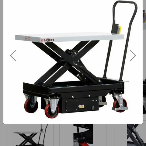 Bordet har en robust metalramme og en stor platform til løft af tunge genstande. Velegnet til industrielt brug eller lagerarbejde.