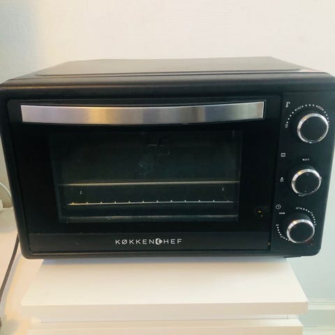 Køkkenchef Miniovn (ikke mikroovn) i sort farve. Kompakt størrelse velegnet til mindre køkkener eller som ekstra ovn. Udstyret med drejeknapper til temperatur, funktion og timer. Inkluderer rist og bageplade. Der er ikke prismærke på men den koster pt 399 kr. i Bilka.