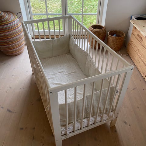 IKEA Tremmeseng børneseng i træ med tremmer, designet til børn. Sengen har en naturlig træfarve og inkluderer en madras. Den er velegnet til brug i børneværelser og sikrer en tryg soveplads for børn.