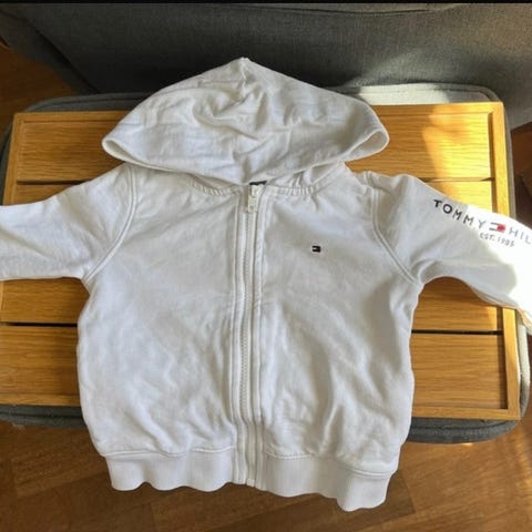 Tommy Hilfiger hættetrøje i blå farve lavet af bomuld. Hættetrøjen har lynlås foran, hvide striber på ærmerne og trykt tekst på bryst og ryg. Designet er velegnet til børn i størrelse 128.