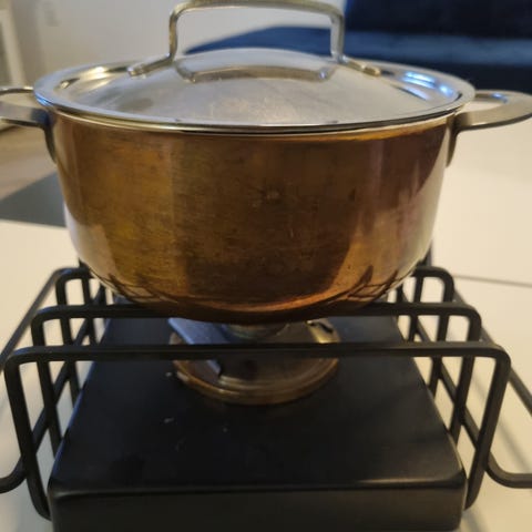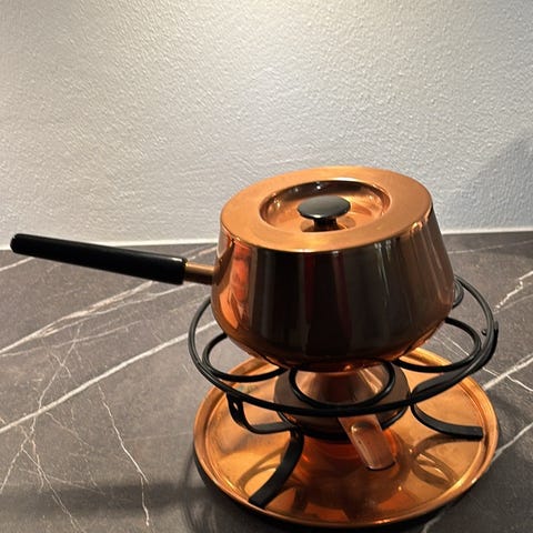 Fondue sæt i kobber. Der mangler en dup på den ene pind