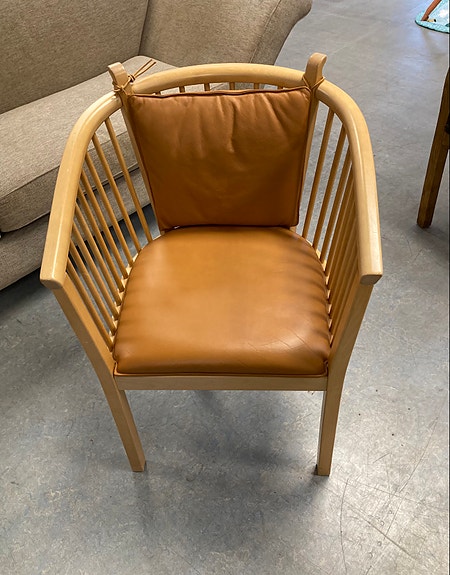 Udført i lyst træ med sorte skindhynder.