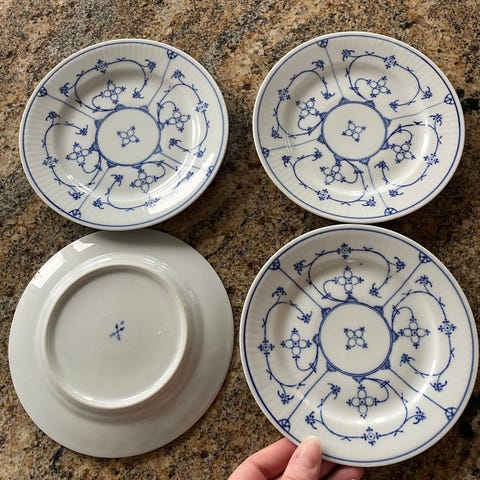 2 helblonde tallerkener med små afslag i kanten. Tallerkenerne er første sortering med nr. 1087. Afslagene ses på billedet og ellers ingen synlige brugsspor. Stort set aldrig brugt.