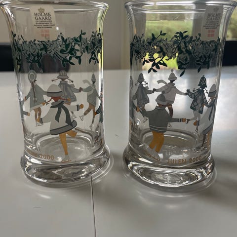 6 stk. Holmegaard glas med julemønster. Glasene har dekorative motiver i rød og gullfarge. Egnet til bruk ved servering av drikkevarer, spesielt i julehøytiden.