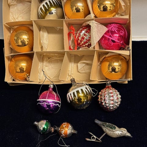 Kasse med farverige gamle julekugler med flot patina.