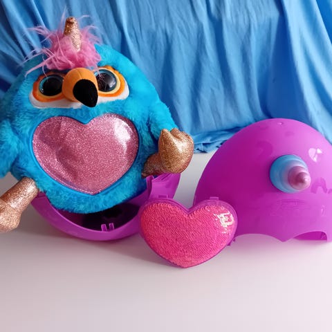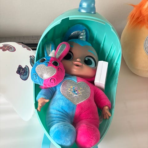 Medfølger pink vugge med låg, tæppe, sut, uåbnet guld slim. og andre små ting.