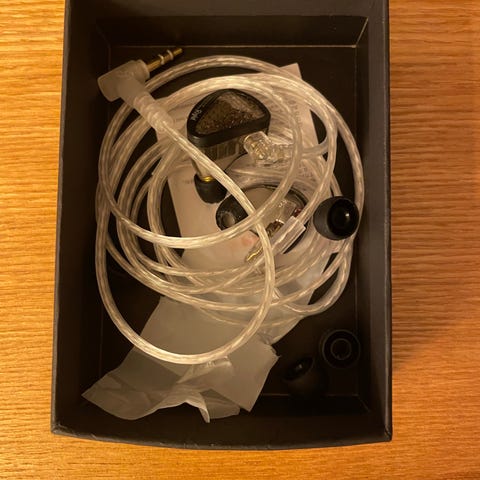 Rigtig lækre, high-end in-ear earbuds med mikrofon fra italienske K-array. Stort set ubrugt. Der er desværre forsvundet en enkelt af ørepropperne, men der er flere at vælge i mellem.