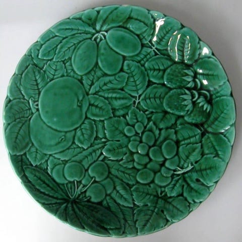 Håndpresset keramik med hævede frugter og bladmotiv i klassisk grøn majolika-glasur.