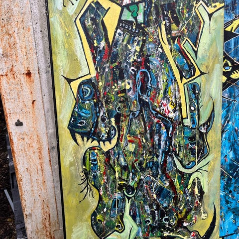 Abstrakt maleri med et farverigt motiv bestående af blå, gule, sorte og røde nuancer. Maleriet har en kompleks sammensætning med geometriske former og linjer, der skaber et dynamisk udtryk.