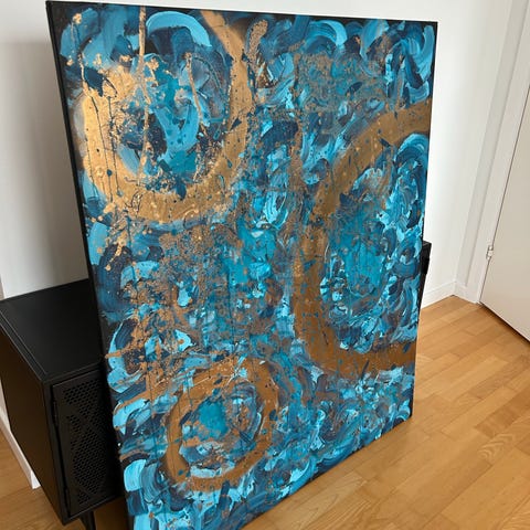 Abstrakt maleri med et farverigt og detaljeret motiv. Maleriet indeholder flere lag og forskellige farver, hvilket skaber et komplekst og unikt udtryk. Velegnet til dekorative formål i hjem eller kontormiljøer.