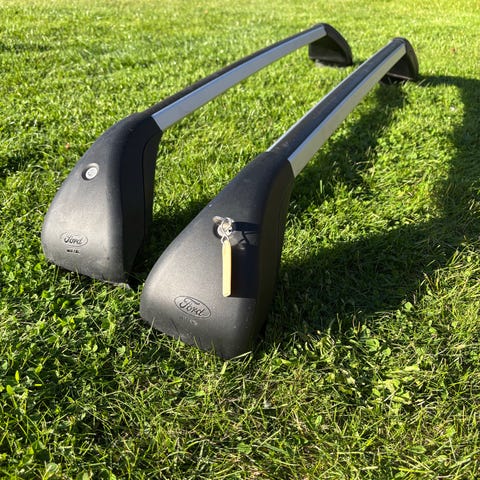 Ford tagbøjler i aluminium med sort beslag. Designet til montering på tag, egnet til transport af ekstra bagage eller udstyr.